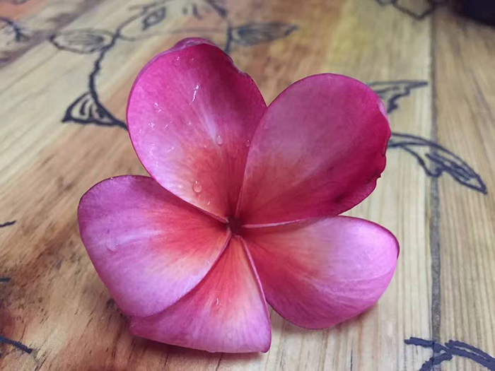 我對于占芭花的印象和對勐賽的最初印象是一致的,新鮮而陌生:新鮮能激發(fā)人的探知欲,陌生又會帶來莫名的違和感。但是,當(dāng)我靠近它,端詳著它螺旋狀的五片花瓣并聞到那淡淡的清香時,我心想,它被稱作老撾的國花,名副其實(shí)。在寬大而碧綠的葉子間,一朵朵或紅或白的占芭花點(diǎn)綴其間,不疏不密,不濃不淡,寧靜而熱烈,樸實(shí)而圣潔,就像老撾人民對生活的態(tài)度。據(jù)說,在老撾的傳統(tǒng)節(jié)日潑水節(jié),只有代表神靈的佛像、虔誠而高貴的佛教徒、至愛親朋,或者遠(yuǎn)方的貴賓才享有被浸有占芭花的水淋身的待遇。
