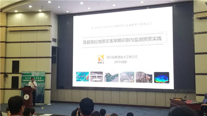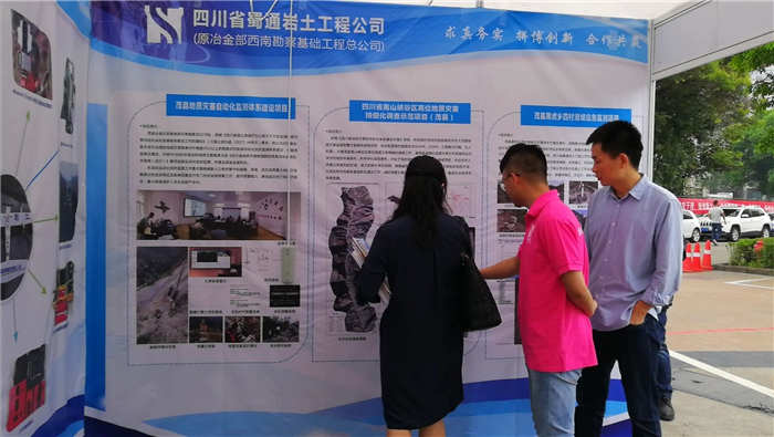 會議期間,蜀通巖土公司在研討會的展位上,通過懸掛展板、分發宣傳單、展示新型設備等方式生動形象地對公司的自動化監測預警、精細化調查、勘查治理等地災防治項目及成都市城市地下空間、金陽縣環境承載力綜合評價等新領域項目進行了介紹,得到了參會人員的高度關注。同時,公司向與會代表作了《茂縣高位地質災害早期識別與監測預警實踐》為題的專題報告,介紹了我公司在茂縣開展的高位地質災害早期識別及自動化監測等工作,就建立多源數據災害解譯標志、構建綜合解譯系統、完善監測預警方法等問題進行了交流。